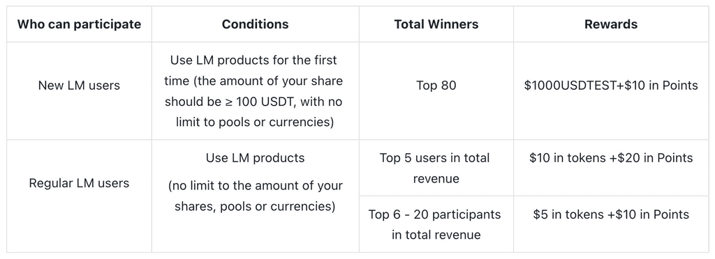 Participants need to add liquidity according to the following requirements to get a chance to win a bonus. A total of 100 bonuses will be served on a first-come, first-served basis!