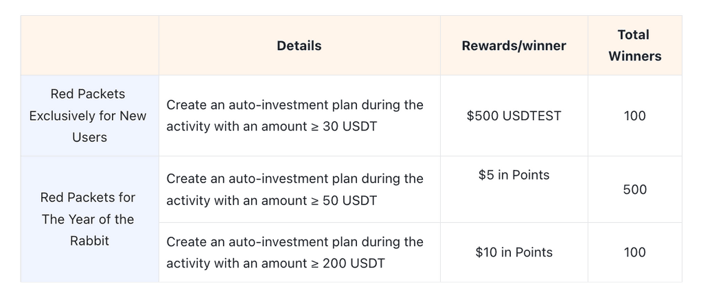 Reminders:-It is a must for participants to fill in the form.-To win red packets, you need to use auto-investment during the activity.-The invested amount should fall within the required scope listed in the above chart.