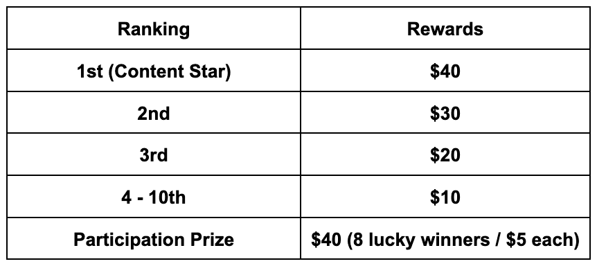 2. We will pick “Content Star” winners weekly and distribute the rewards accordingly.