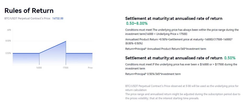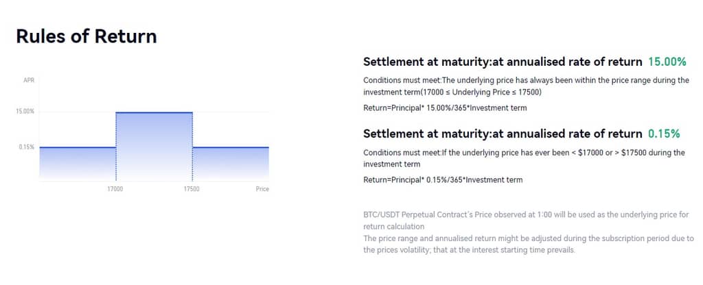 - During the observation period, if the price of the target asset moves the upper/lower limit of the price range (that is, knock out the range), the user will obtain a guaranteed return.