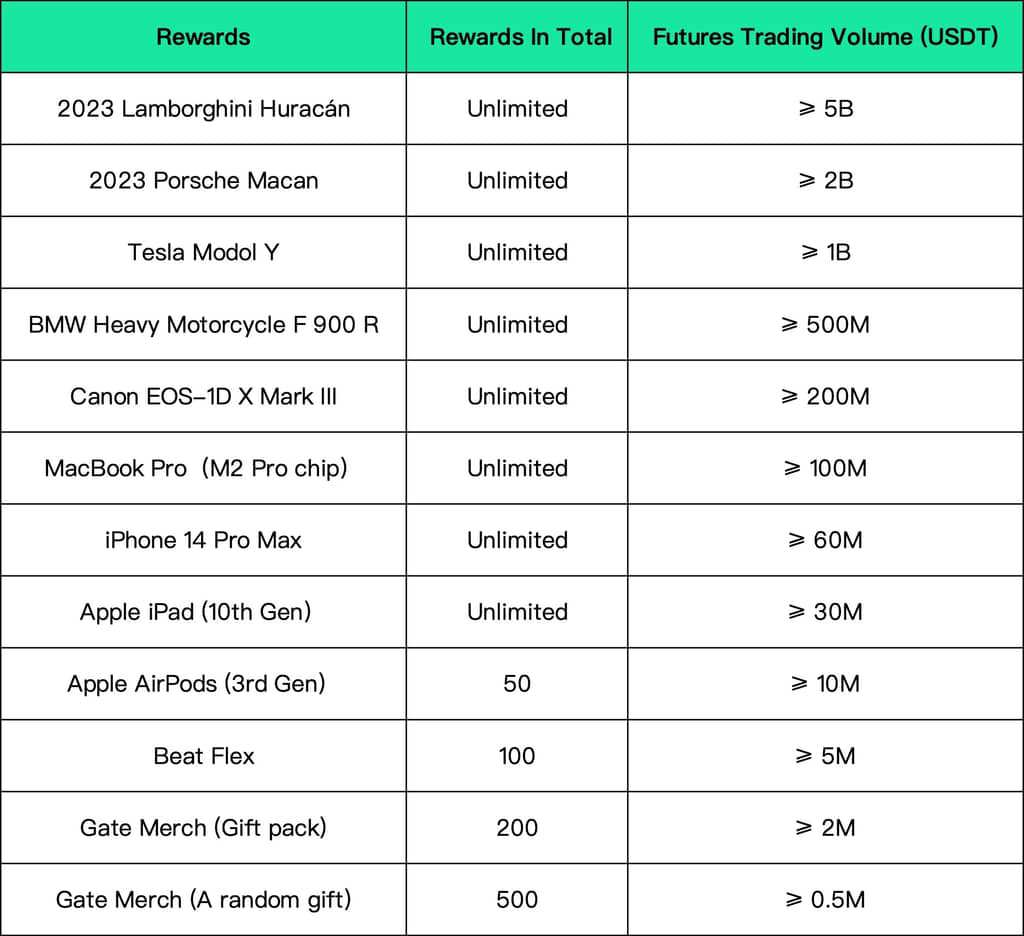 Event Descriptions:1.Futures Trading Volume Calculation = Open position Closed position (During the event)2.All Trading Pairs of USDT-Margin Perpetual Contract (BTC-M contracts and delivery contracts are excluded).3.Maximum 5 members each team. The captain can not disband a team once it is formed.4.The cumulative trading volume of the user (team competition) will be counted at the end of the event and the reward will be issued. Each user can only receive the reward once.5.One user can only participate with one verified main account. Sub-accounts cannot participate. Except for Web3 users, KYC is needed to participate in the event.6.For the fairness, this event is limited to users who trade manually. API users and other types of users are not allowed to participate.7.Teams can only win rewards valued no less than a MacBook Pro (as rewards valued less than a MacBook pro are not enough for a team to share). If the cumulative trading volume is less than $100M, the team will not be able to claim any rewards.8.Deleting team members requires the review of the Gate.io Official (@Gateio_Affiliate) and the team member will be deleted only if both the captain and the team member agree to the request. When a team member is deleted, the trading volume contributed by the team member will also be removed from the total trading volume.9.When an individual joins a team, he/she must sign the Rewards Sharing Agreements for the event developed by the captain, which will act as a contractual constraint during the entire event and in the reward distribution phase after the event. The rewards earned by the team will be distributed to the captain after the event, and the captain will distribute them in accordance with the Rewards Sharing Agreements.10.The first three physical rewards of the event involve vehicle booking, manufacturing, transportation and other processes. The final delivery time of the vehicle to the user is subject to the actual delivery time of the vehicle manufacturer.11.Market analysis provided by the captain does not represent the opinion of Gate.io. Gate.io will not be responsible for any trading losses suffered by any team member.12.Risk warning: cryptocurrency trading is affected by many factors such as market fluctuations and policies. The market fluctuates greatly and it is difficult to predict. Please make sure to pay attention to market risks and trade with caution.13.Participants who cheat will be disqualified from participating.14.Gate.io reserves the right to the final interpretation of this event.