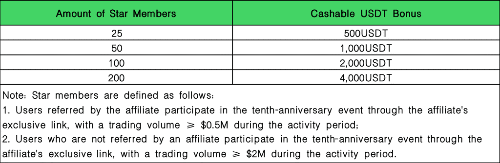 Affiliate invites users to participate in the tenth anniversary contract trading event through an exclusive link. Once the number of star members invited reaches a certain amount, the affiliate will receive a cashable USDT bonus!To obtain your exclusive link please contact with your BD manager. If you have not yet become an affiliate you can contact our telegram:@Gateio_Affliate.