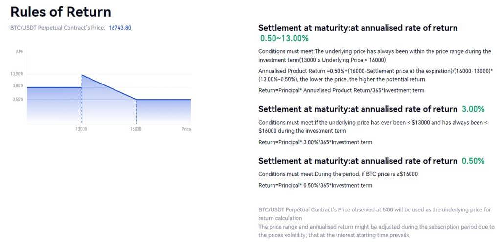 - During the observation period, if the prices of the target asset fell lower than the lower limit of the price range but didn’t go beyond the upper limit of the price range, the user will obtain the guaranteed yield rate(0.5%).