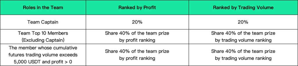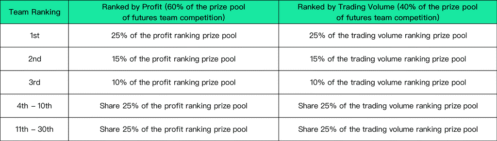 V. Competition RulesThe following rules apply to futures team competitions, futures individual competitions, and spot individual competitions across all divisions:➣ Competition 1: Futures team competition shares 70% of the prize pool in each division, with a max of $3,500,000 to be distributed across all divisions.(a) In each division, the teams are ranked according to the profit and trading volume respectively in participating teams. Among them, those profit rankings account for 60% of the prize pool of futures team competition, and those trading volume rankings account for 40% of the prize pool of futures team competition. The detailed rules are as follows: