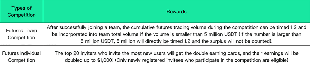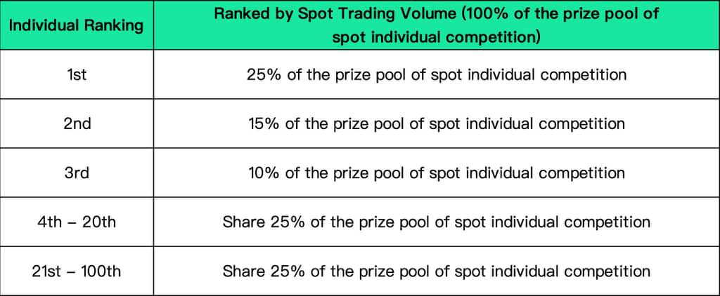 Notes:1.To participate in the spot individual competition, users' individual spot trading volume has to exceed 10,000 USDT.2.In each division, spot individual competitors can choose to participate in futures team competition and can win both prizes in futures and spot trading.