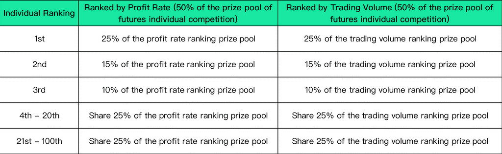 ➣ Competition 2: Futures Individual Competition can share 20% of each division's prize pool, up to $1,000,000 to be shared across all divisions.In each division, users who participate in the futures individual competition will be ranked according to profit rate and trading volume respectively. Among them, those who ranked by profit rate account for 50% of the prize pool of futures individual competition, and those who ranked by trading volume take the other 50%. The details are as follows: