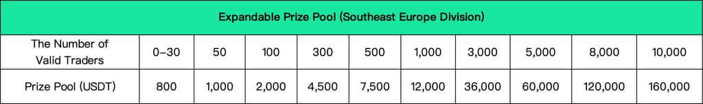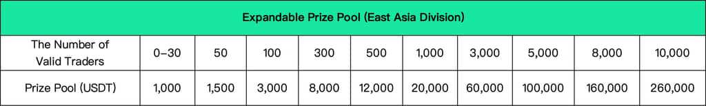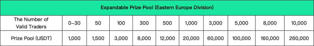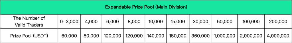 IV. Competition Regions and Prize PoolThe competition will be held throughout the globe in 6 divisions: the Main Division, East Asia Division, Southeast Asia Division, Eastern Europe Division, Southeast Europe Division, and Latin America Division. Each division will keep a expandable prize pool that expands as the number of participants grows. The prize pool for the main division can reach $4,000,000 at max, while the total prizes for the 5 other divisions can go as high as $1,000,000. In each division, the prize for futures team competition, futures individual competition and spot individual competition will be split 70%, 20% and 10% of the total prize pool respectively.