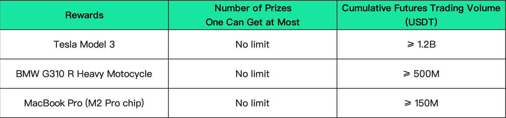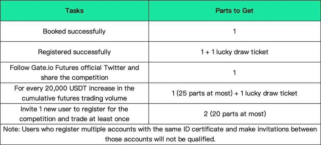 VII. Competition Description1.Before the official registration ends, users still have the ticket to choose to join the futures team competition, go to form a team or join another team.2.If the number of team members is still less than 5 before the end of the official registration, the team captain can disband the team, and team members can choose to join other teams or participate in the individual competition. If the number of team members is less than five after the end of official registration, and the team captain has not disbanded the team, the system will automatically disband the team, and the team members can join other teams by themselves within 24 hours after the disbanding. If a team member does not join another team within 24 hours after disbanding, the system will randomly assign him/her to another team.3.The users that have successfully registered for the competition will be automatically assigned by the system to the corresponding division, which is the information we will verify in the KYC process. No trader is allowed to go beyond his/her own division to compete.4.This competition is held across 6 divisions: Main Division, East Asia Division, Southeast Asia Division, Eastern Europe Division, Southeast Europe Division, and Latin America Division. All participants are required to engage in the competition in accordance with the legal regulations of their respective countries. Should their involvement violate local laws in any way, it would result in the disqualification of their participation.5.The formula for calculating futures trading profit= [Final net assets of the contract account(including unrealized PnL and/or contract bonus) - initial contract account net assets (including unrealized PnL and/or contract bonus) withdrawals of contract account - deposit of contract account]6.The formula for calculating futures profit rate = [realized PnL during the competition (BTC/USDT perpetual ETH/USDT perpetual) unrealized PnL during the competition (BTC/USDT perpetual ETH/USDT perpetual) ] / [ contract account’s initial net value net deposit of contract account during the competition] * 100%7.For ROI ranking in the futures individual competition, the initial futures account net value the deposit amount of the futures account during the competition ≥ 500USDT. Participation in the ROI ranking is limited to BTC/USDT perpetual and ETH/USDT perpetual trading pairs.8.Trading volume calculation = Open position Closed position (During the competition)9.The winner(team and individual) must meet the requirements of futures trading volume ≥ 5,000 USDT during the competition. Early bird bonus will be issued within 5 days after the end of early bird registration.10.For the team that has won the rewards of the team competition, the team captain will not repeatedly participate in the reward distribution among the team members when the internal rewards are distributed. Minimum 5 members and no limit for max members.11.During the competition, once the user registers for the team competition, it cannot be changed, and the rewards of the individual competition and the team competition cannot be obtained at the same time. In the team competition, the ranking by profit and trading volume, as well as the ranking by profit rate and trading volume in the individual competition. The rewards in these two types of competitions can be obtained at the same time without affecting each other.12.All 6 divisions are qualified for the 6 events referred in Part VI - [Event Benefits].13.In [Event 4: Bring home a car!], the prize won by a team will be given to the team captain, while the reward won by an individual trader will be distributed to the trader himself/herself.14.If you win a car in [Event 4: Bring home a car!], we have to order the car to be manufactured for you. So you have to wait to receive its delivery, as the manufacturing of it involves a long process of order submission, production, transportation, and so on. The winner of the Tesla Model 3 will have the privilege of specifying their preferred delivery location (country/region). However, the chosen destination should not impose taxes on the vehicle that would result in a total cost exceeding the after-tax price of the same car purchased in Hong Kong.15.Participants can only participate in this competition with one account, and the sub-account doesn’t count. KYC is needed to receive competition rewards (except for Web3 users).16.To maintain the fairness of the competition, this competition will not be open for users of VIP11 and above as well as API traders.17.The final prize pool is determined by the number of valid traders, the number of valid traders = the number of participants registered in the competition - the number of users who have not opened positions during the competition - the number of users determined by the risk control system as a user who violated the event rules(including but not limited to batch registration of inflated prize pools, matching transaction, self-dealing, etc.). The number of valid spot trading users are those with accumulated spot trading volume exceeding 10,000USDT during the competition.18.During the competition, the team captain can invite new users via invitation link to register and join the team. Up to 60% long-term commissions and $800/month base salary by inviting your friends.19.What is the perpetual contract bonus of Gate.io?Gate.io perpetual contract bonus can be used as margin and deduct losses, trade fees and funding fee. Gate.io perpetual contract bonus are designed to facilitate new and existing users to experience the function of contract products without risk in real contract trading.20.The market analysis provided by any team captain does not represent the official opinion of Gate.io.21.Gate.io does not assume any responsibility for any transaction loss suffered by any team member.Risk warning: crypto-currency trading is affected by many factors such as market fluctuations and policies.