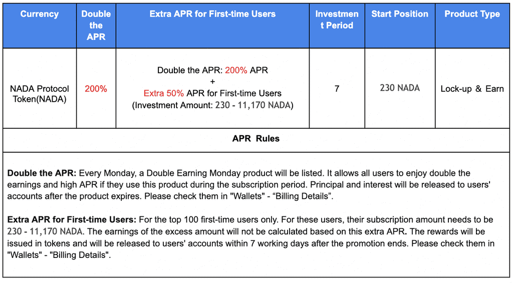 Earning Accrual Rules: Interest begins to accrue at 1:00 AM UTC the next day after tokens are lockedEarnings Calculation: Based on the specified APREarnings Distribution: Distributed when the product expiresUnlocking Rules: Unlocked when the product expiresWhen to receive: Assets will be received immediately after they are unlocked.