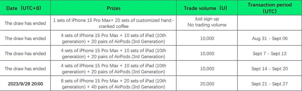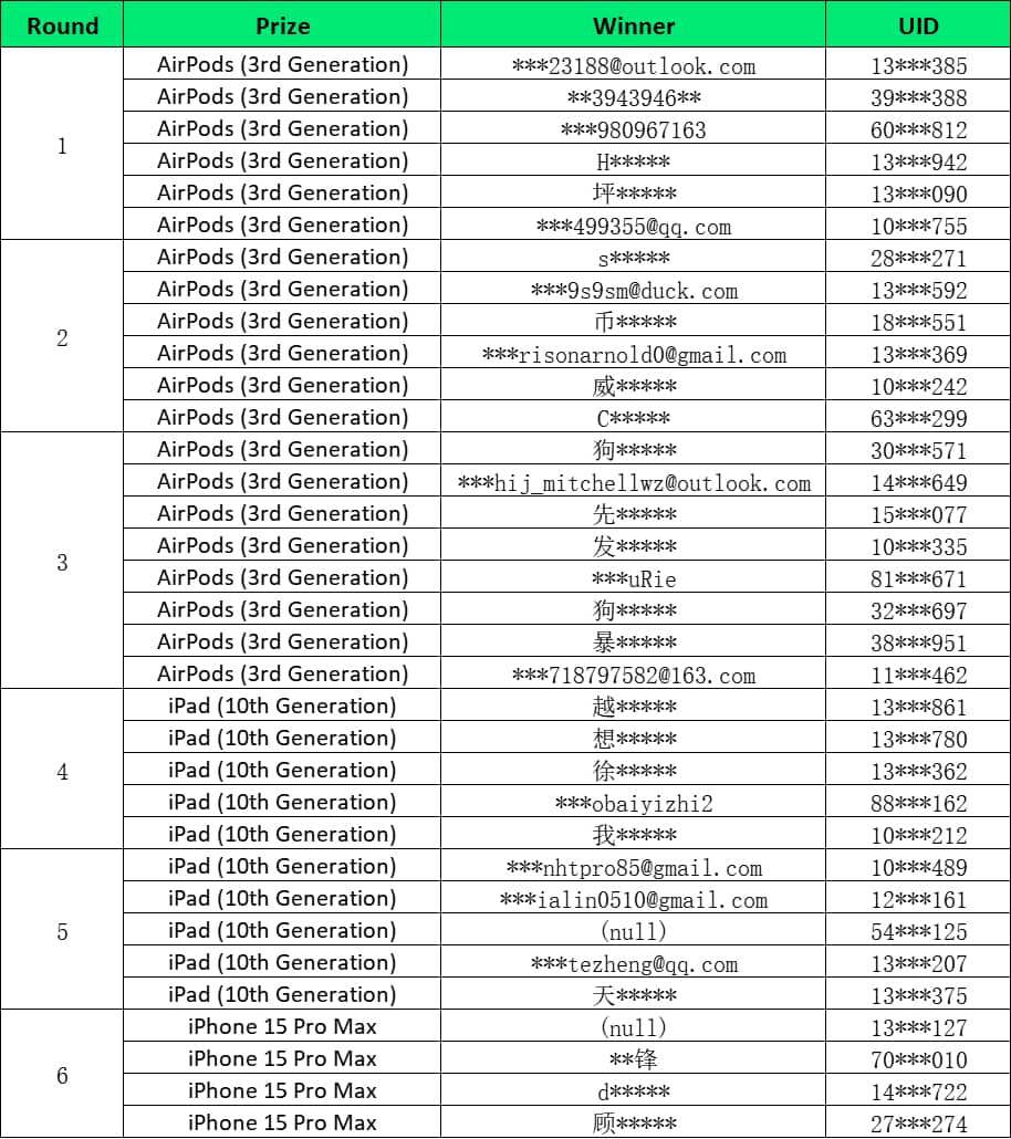 Dear Gate.io Users:The Four round of WCTC S5 live lottery has been successfully held. Thank you all for your support of this event, and thank you to the special guests in the live broadcast for bringing joy to the event.After six rounds of live draws, there were 20 traders who won the AirPods (3rd Generation),and 10 traders who won an iPad (10th generation), and 4 traders who won an iPhone 15 Pro Max. Congratulations!