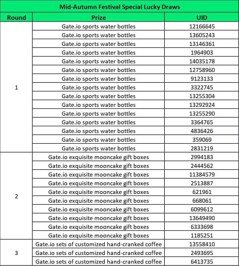 Below is a list of winners in the Mid-Autumn Festival Special Lucky Draws , together with screenshots of the prize drawing result. Winners should also click the link below to fill in your mailing address, which will be used to receive the prize.Address information request form:https://www.gate.io/zh/questionnaire/3665