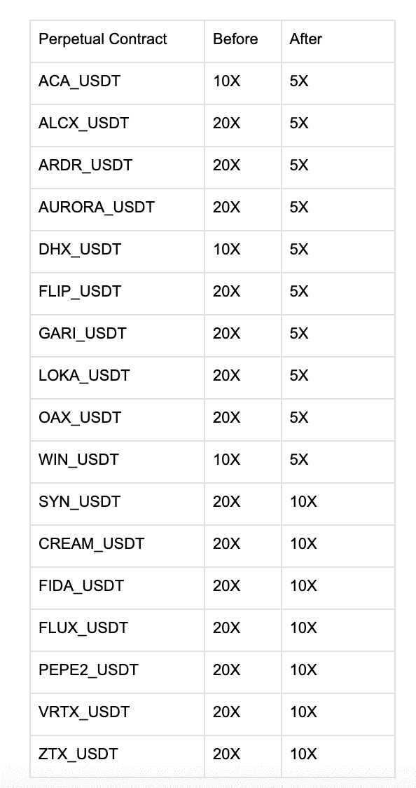 To provide users with enhanced trading experience, Gate.io periodically reviews perpetual specifications and parameters based on market conditions and may make adjustments accordingly. With the recent review, Gate.io is going to adjust the maximum leverage allowed for the following perpetual, effective 08:00 UTC, December 04, 2023.