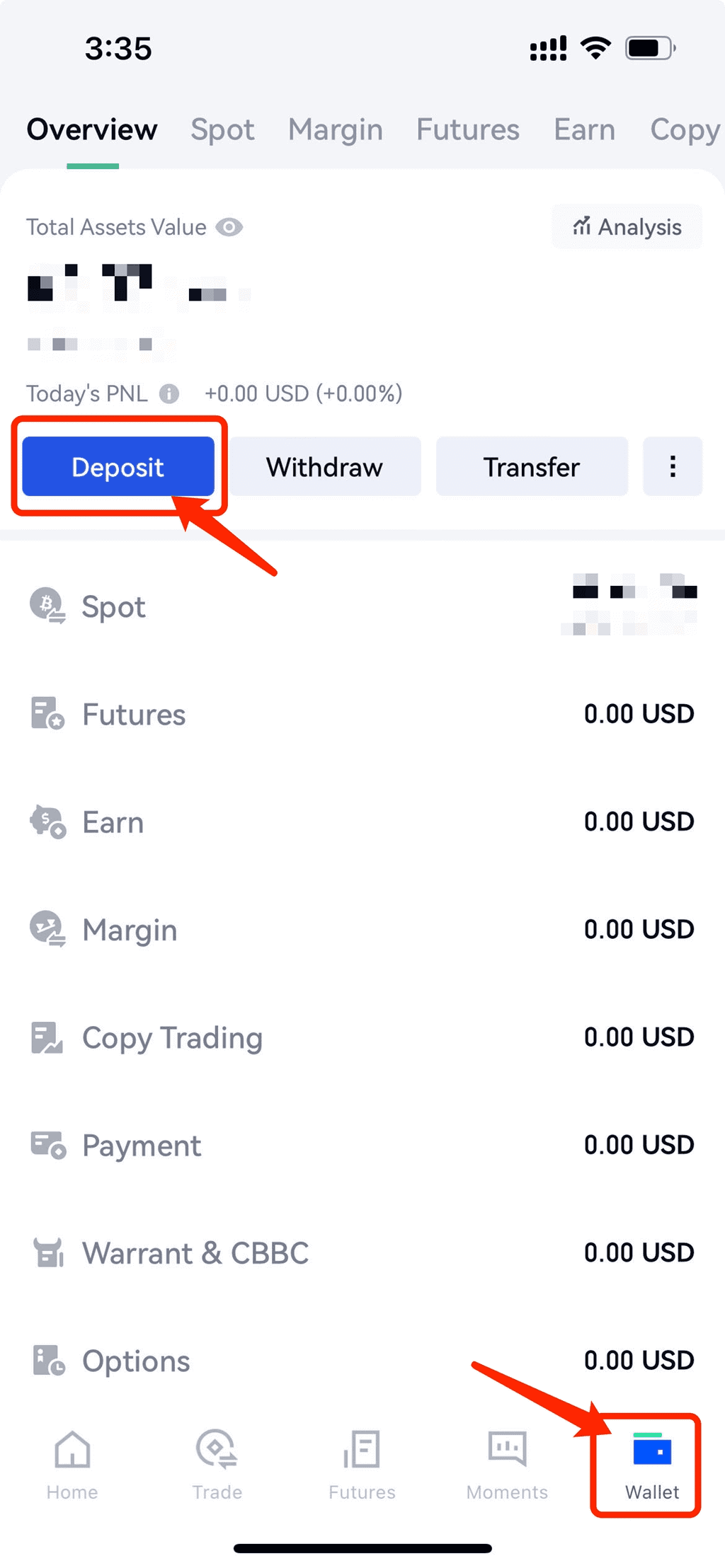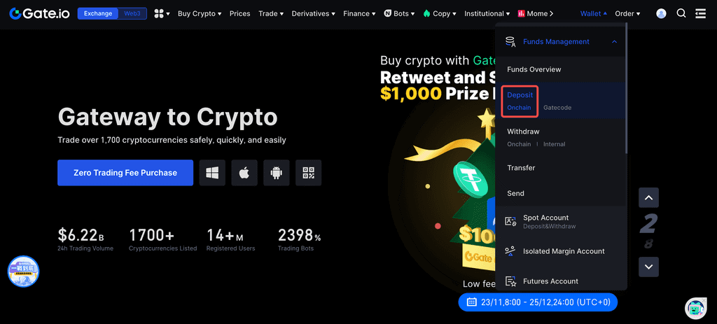 1. Go to the Gate.io mobile app main page, select "Wallet", and then "Deposit".