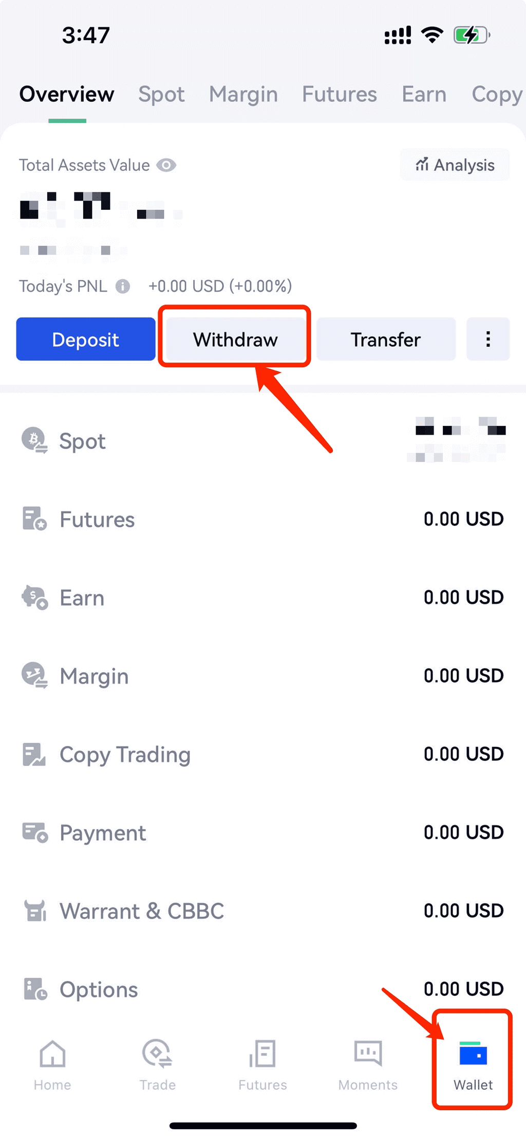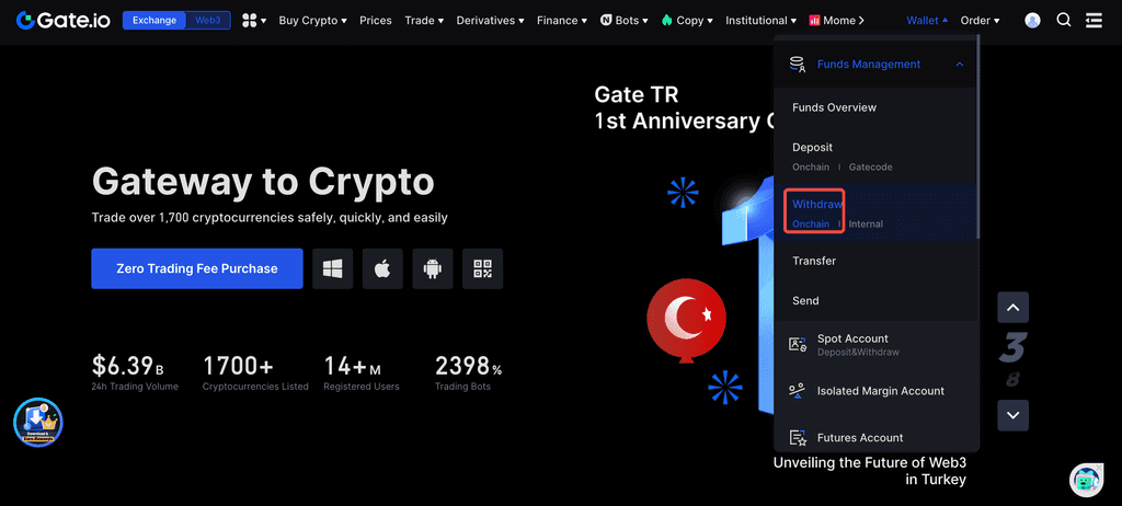 1. Go to the Gate.io mobile app main page, then select "Wallet", and then "Withdraw".