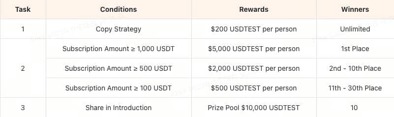 1.Click on the event registration link.2.Copy your favorite Auto-Investment strategy.3.Allocate funds to your strategy.4.Complete the tasks and earn high rewards.