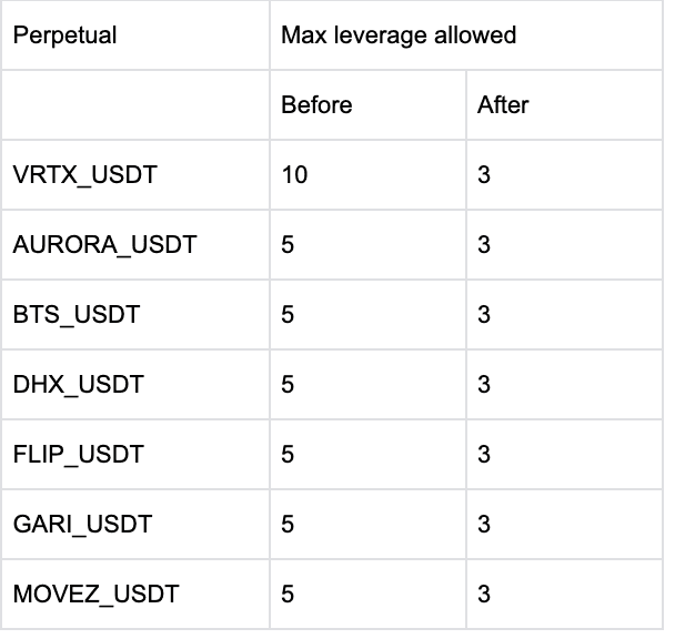 The adjustment to the maximum leverage will come into effect at 08:00 UTC, December 20. Positions opened before this time will still have the maximum leverage before the adjustment.