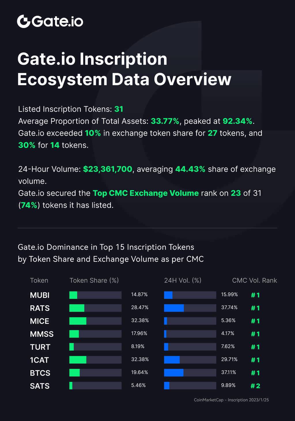 - Gate.io was a frontrunner in the BRC20 market, introducing 31 types of Inscription tokens. These accounted for an average 33.77% share of Inscription tokens held on exchanges, with more than 74% leading in trading volume on CoinMarketCap.