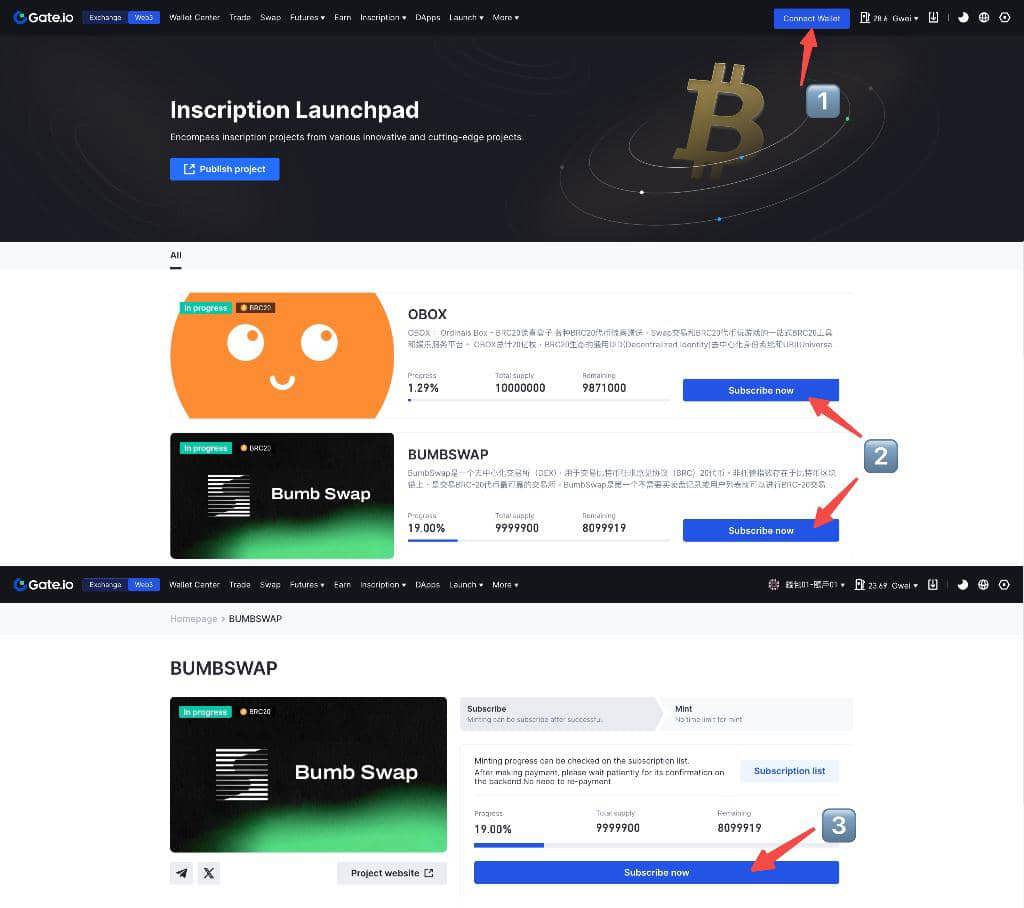 Step 1: Connect the Gate Web3 Wallet and make sure there are enough BTC assetsStep 2: Select the project you want to subscribe toStep 3: Click 【Subscribe Now】. After the application is successful, you can start minting