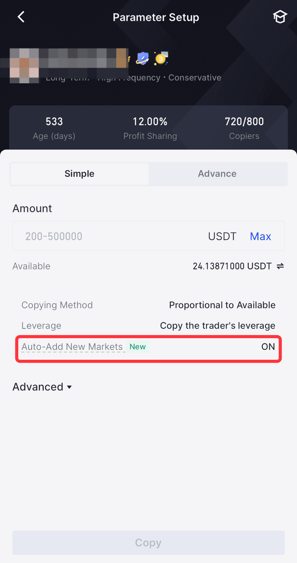 Advanced Copying Mode: Enter the copy trading home page - filter the lead traders - click the copy button - select "Advance" - Select "Auto-add New Markets"