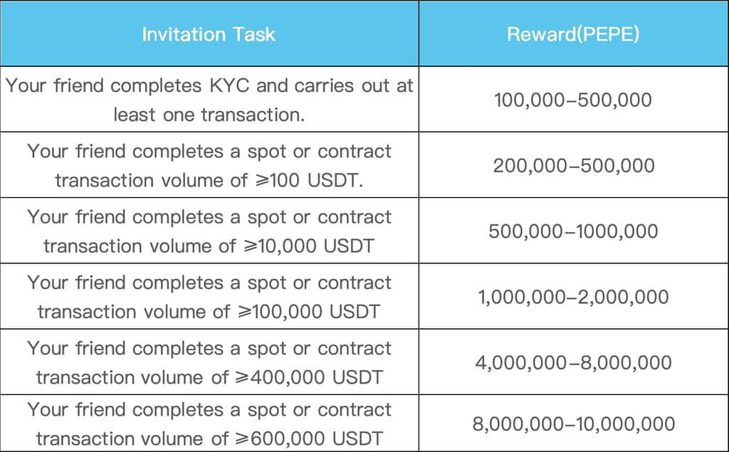 ##🎁 Event rules:PEPE airdrop exclusive invitation rewards!During the event, you can earn corresponding rewards by inviting one friend to complete the exclusive invitation tasks. There is a total airdrop reward pool of 2 billion PEPE tokens, available on a first-come, first-served basis! Quickly copy your referral link and share it with your friends! Details are as follows:
