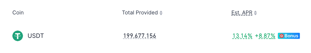 If you lent out your USDT assets during the activity, you would enjoy an original APR of 13.14% and an extra reward of 8.87% APR at the time you lent it out successfully. That means you can enjoy 13.14% APR for the hour and an extra 8.87% APR equivalent to the extra rewards, with a final APR of 22.01%.