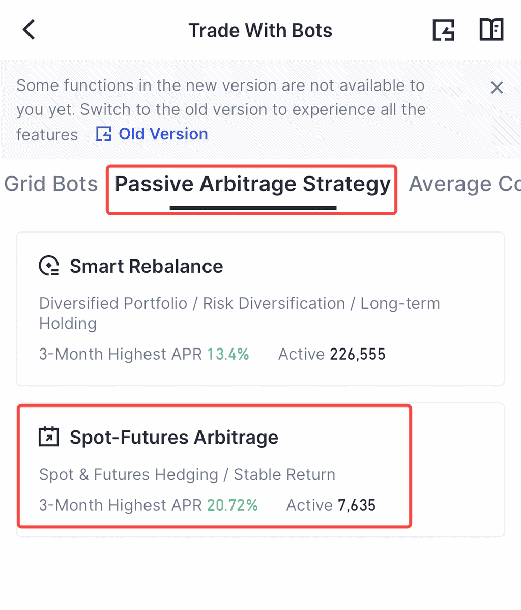 **APP: **Enter Bots homepage — Create — Passive Arbitrage Strategy — Spot-Futures Arbitrage — Create