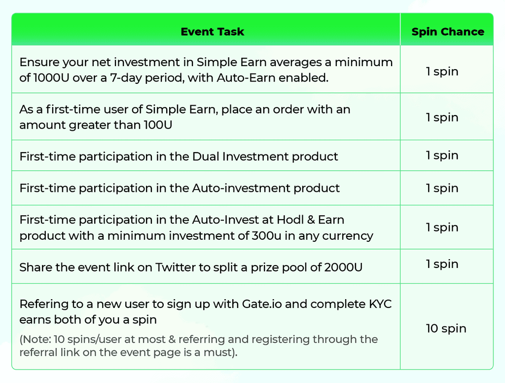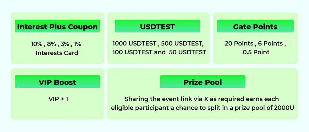 1.Data recorded by the Gate.io backend will be the basis for distributing rewards. Users must click “Register Now” to sign up for the event.2.Users must complete KYC to participate in the event. Only the principal accounts are eligible for participation, while sub-accounts are disqualified for the event.3.For each account, each task can only be claimed once, except invitation tasks, which can be repeatedly claimed up to 10 times.4.Rewards will be distributed in the form of Gate Points (valid for 15 days), USDTEST (valid for 7 days), Interests Card (valid for 7 days) and VIP 1 (valid for 7 days).5.VIP 8 and above users who receive the VIP 1 reward will not have their level increased; instead, their VIP status will be extended for an additional 7 days.6.We will take statistics of users’ performance every Sunday at 16:00 UTC 8 starting from April 28th, and distribute rewards within 2 working days. Rewards received can be checked in “My Wallet-Billing Details” and via Reward Announcement.7.Cheating is strictly forbidden in the activity to protect the interests of all participants and uphold fairness. Any user who is discovered to commit cheating behaviours will be disqualified from the event.8.Users who violate any of the above conditions will be disqualified from receiving prizes.9.Award information will be announced on the Gate Earn GateEarn Twitter and GateEarn Telegram groups. Follow us for more event information.10.Gate.io reserves all the rights to the final interpretation of the event.