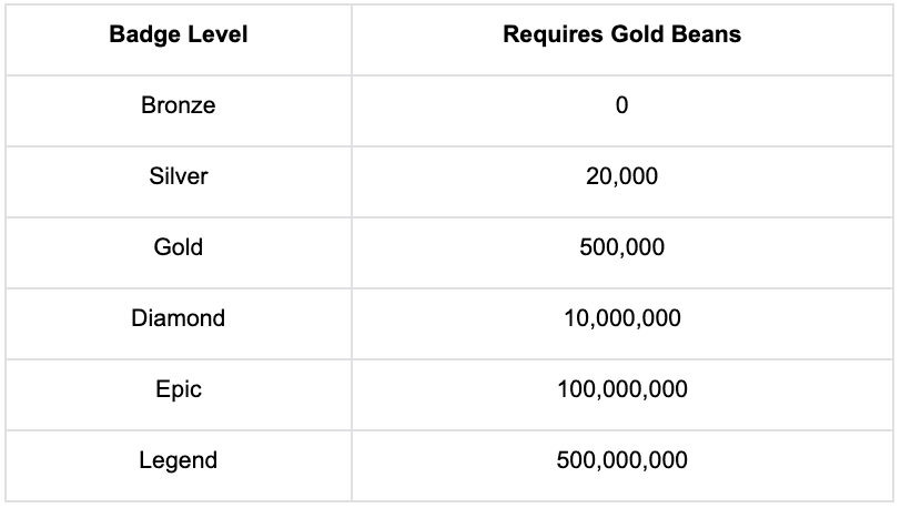 ➣ Badge Level UpgradesPlayers can upgrade badge levels by obtaining gold beans. The number of gold beans required to unlock each level is as follows: