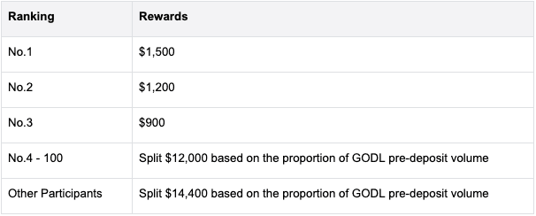 🎁 Reward 1: Join GODL Pre-Deposit to Split $30,000**➠ Pre-deposit GODL **During the event, complete GODL pre-deposit, users can share in a $30,000 prize pool based on their ranking by pre-deposit volume. Everyone is eligible to win a share, ensuring a 100% reward.