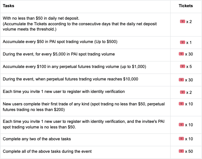 Notice:1.All participants need to complete identity verification to claim rewards.2.Trading volume = buy volume sell volume.3.Net deposit volume= (deposits fiat buys) – (withdrawals fiat sells). Deposits are limited to on-chain deposits. Fund transfer/Gatecode deposit among Gate.io accounts will be invalid. The daily net deposit data will be calculated at 23:59 (UTC) each day.4.The rewards will be in PAI, with a total prize pool of 33,333 PAI. Participants must complete any PAI spot trading during the event to be eligible to split the Ticket Prizes Pool. Rewards will be distributed in project tokens within 14 working days after the campaign ends (“Wallet”–“Bill”.) The rewards distribution announcement will be released at Gate.io News.5.The use of duplicate accounts and any other cheating behaviors, such as inflation of trading volume, bulk registration of fake accounts, self-trading, order matching, etc, are strictly prohibited. Multiple accounts with the same KYC verification information will be treated as the same account.6.Market makers, corporations, institution accounts and affiliate accounts are not eligible to participate in this event.7.Users can only receive rewards from one campaign if participating in many other campaigns on Gate.io at the same time.8.Where any discrepancy arises between the translated versions and the original English version, the English version shall prevail.9.Gate.io reserves all rights to the final explanation.10.This event is not affiliated with Apple Inc.11.Users in the United Kingdom and other Restricted Locations cannot access the Services (including the participation in this event or competition). See the User Agreement for further details on Restricted Locations. We do not intend to solicit or conduct marketing towards customers in such restricted locations.