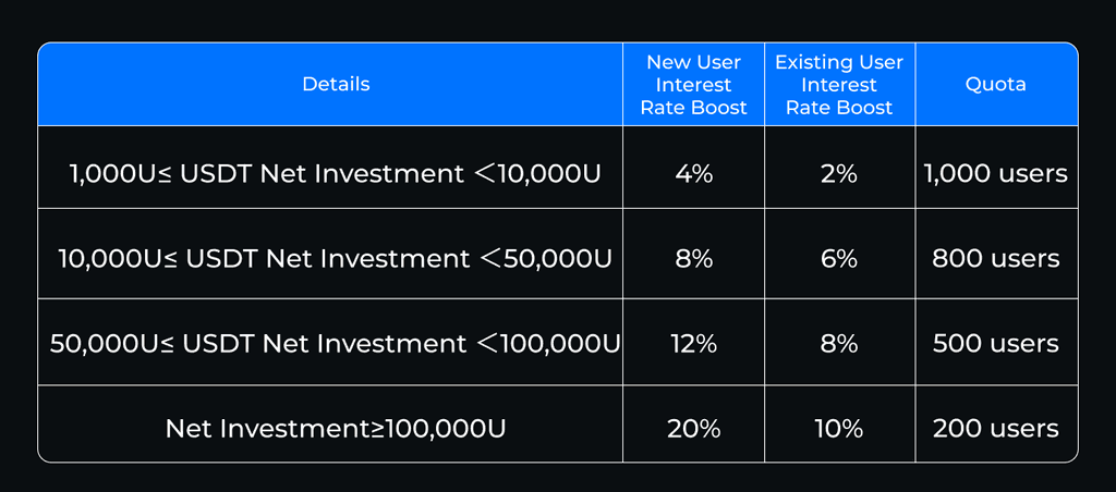 **Reward Details: **New and existing users subscribing to USDT flexible terms can receive additional interest rewards based on their net USDT investment.The additional interest rate varies depending on the net USDT investment, as outlined below: