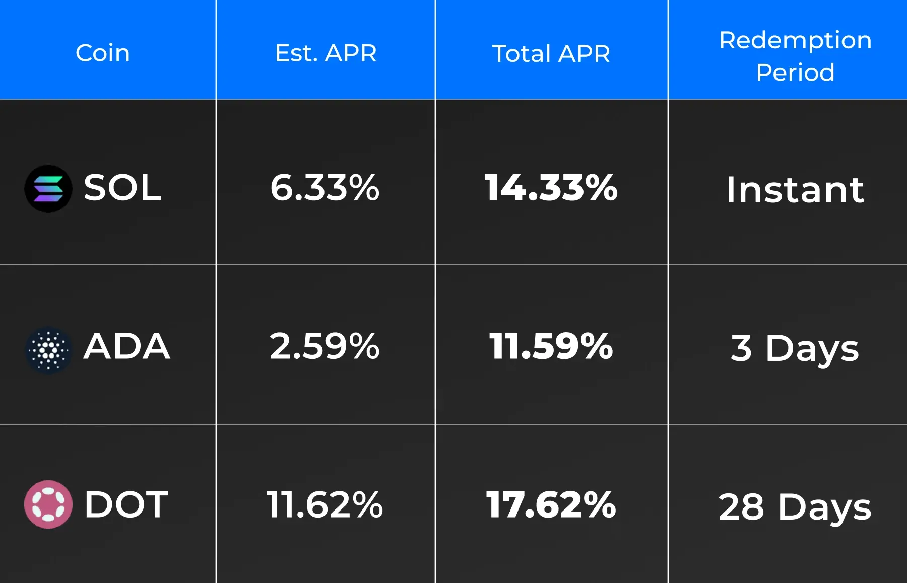 Product Interests Calculation Period:• SOL: Staked on Day D, interest distributed on Day D 1.• ADA: Staked on Day D, interest starts on Day D 1, distributed on Day D 2.• DOT: Staked on Day D, interest starts on Day D 1, distributed on Day D 2.