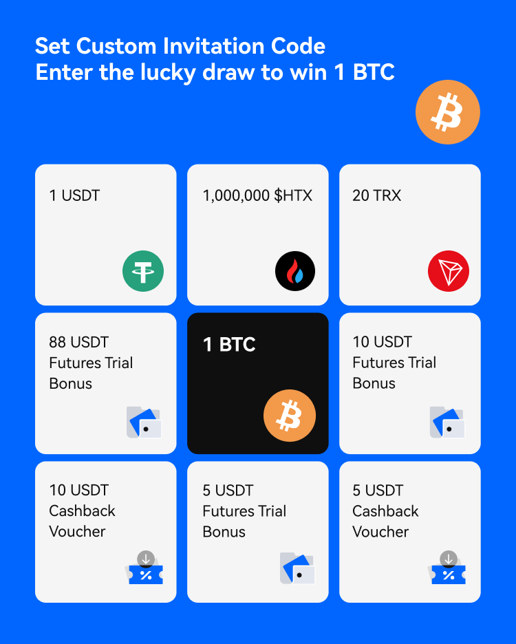 HTX is thrilled to announce the launch of our Custom Invitation Code feature. Starting today, you can create your own unique, personalized referral code. Invite friends to sign up and trade on HTX for a chance to win a grand prize of 1 BTC. Plus, there are plenty of other rewards up for grabs, like USDT, $HTX, and Futures Trial Bonuses. Start sharing your code now and unlock greater earning potential.