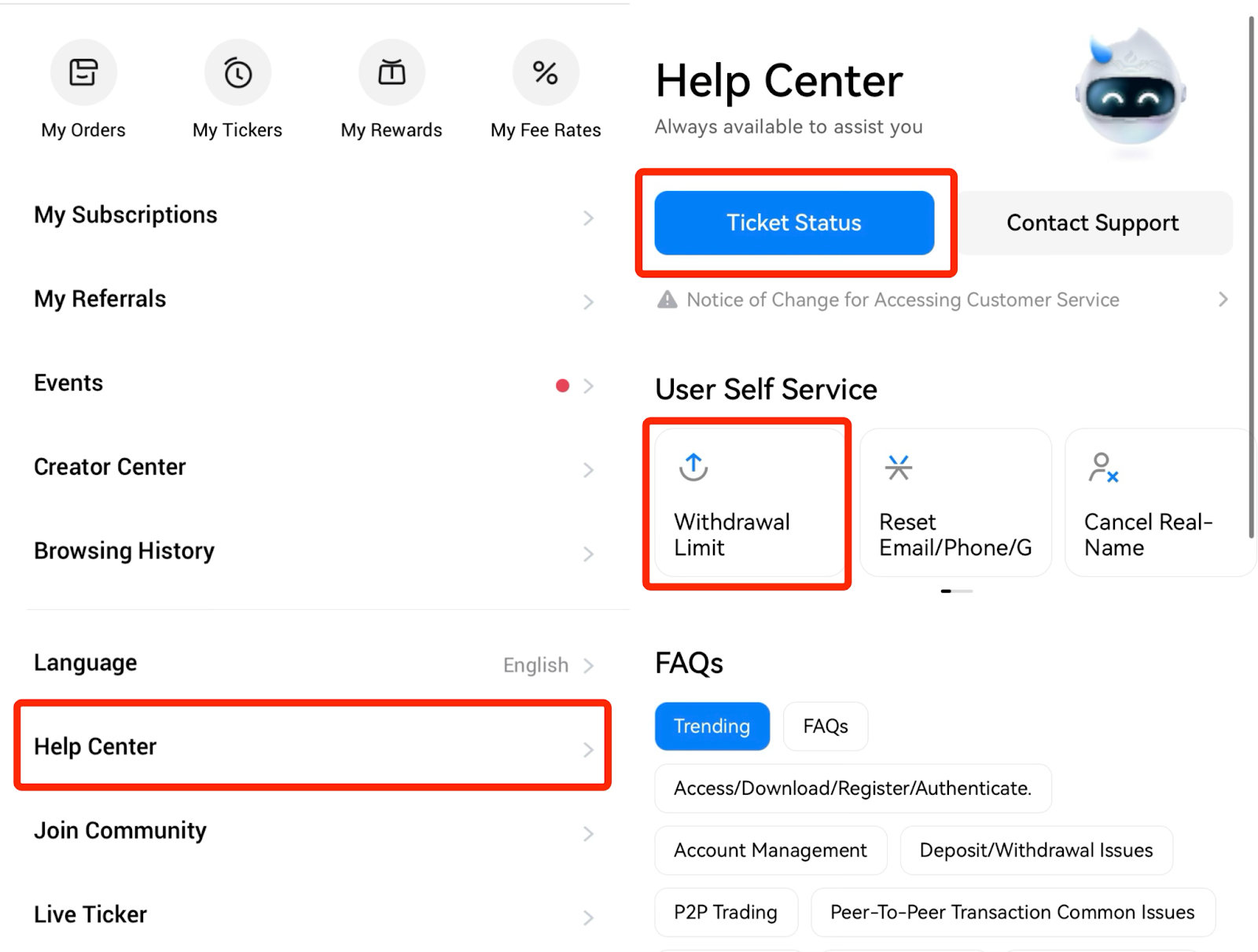 Log in to your HTX account via the app or official website, navigate to [Support] → [User Self Service] → [Withdrawal Limit], fill in the required information, and submit your request ticket. Our support team will respond within 24 hours and keep you informed about your request progress.