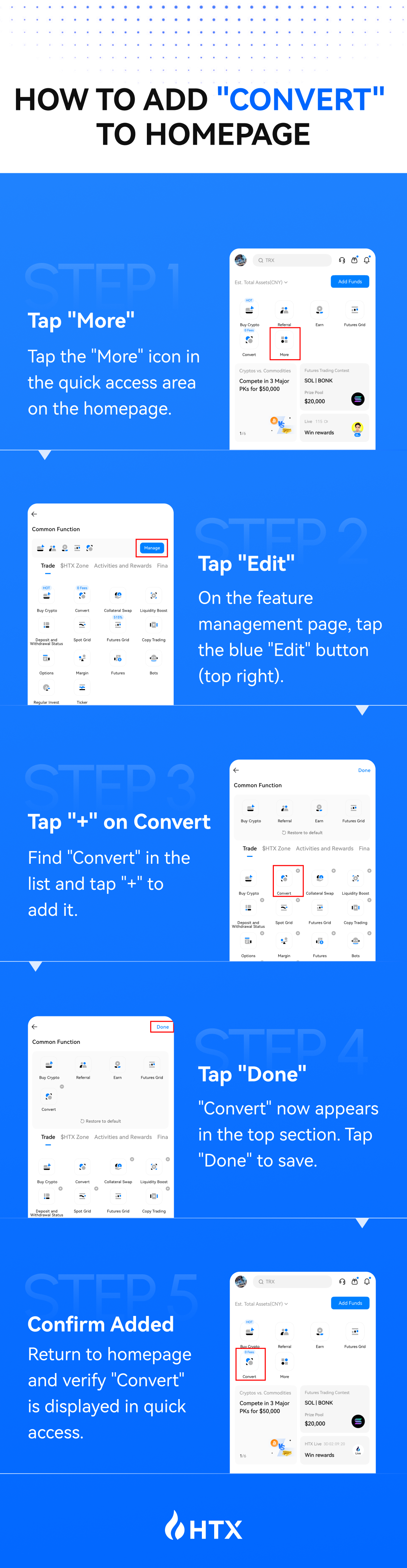 Requirement: Add the Convert icon to your HTX app home screen shortcuts (the Common Function section at the top), keep it there for at least 7 days, and upload a screenshot as proof.