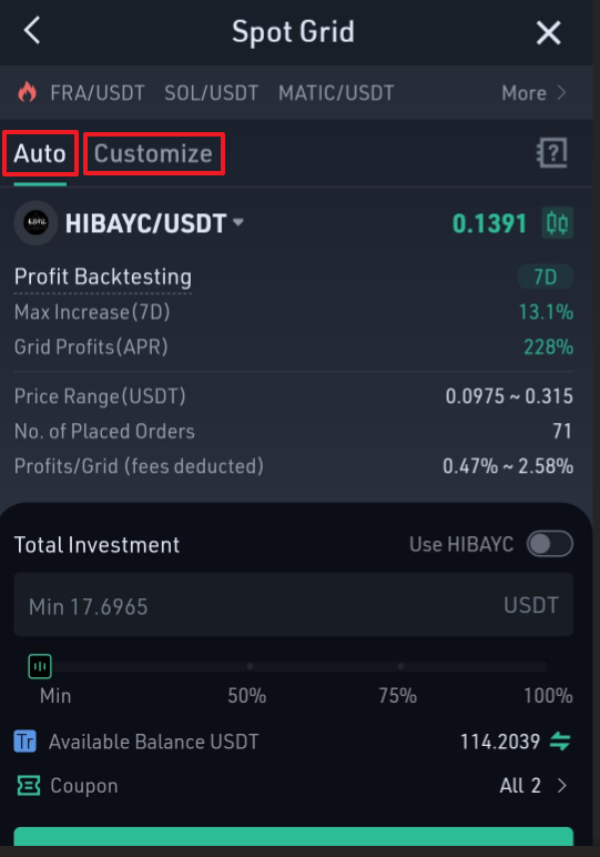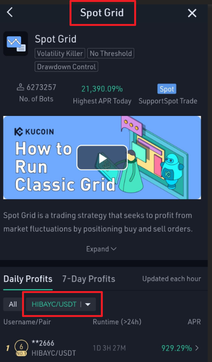 Step 2: Click【Trading Bot】, then select HIBAYC/USDT pair on the Spot Grid market.