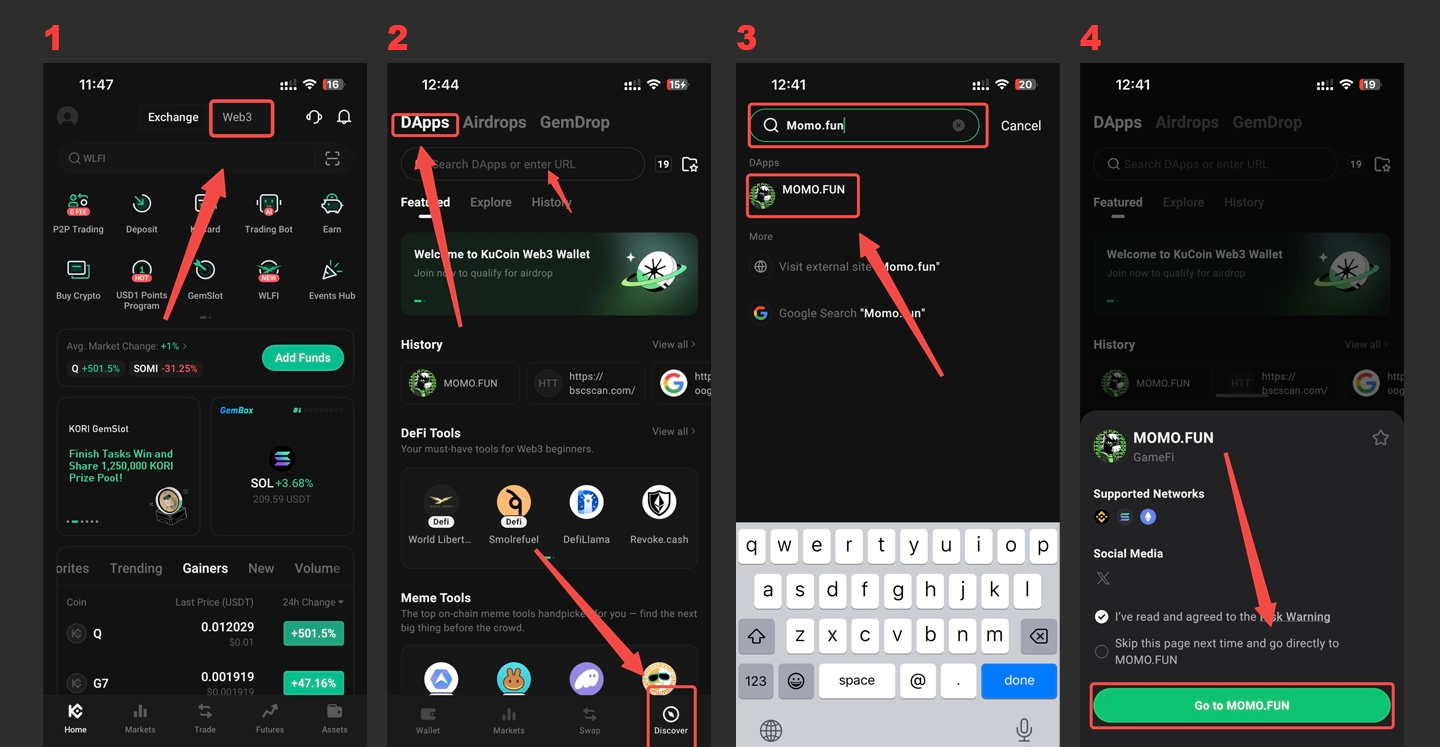 Or go to KuCoin APP - Web3 - Discover - Dapp, search for MOMO.FUN, and click to log in.