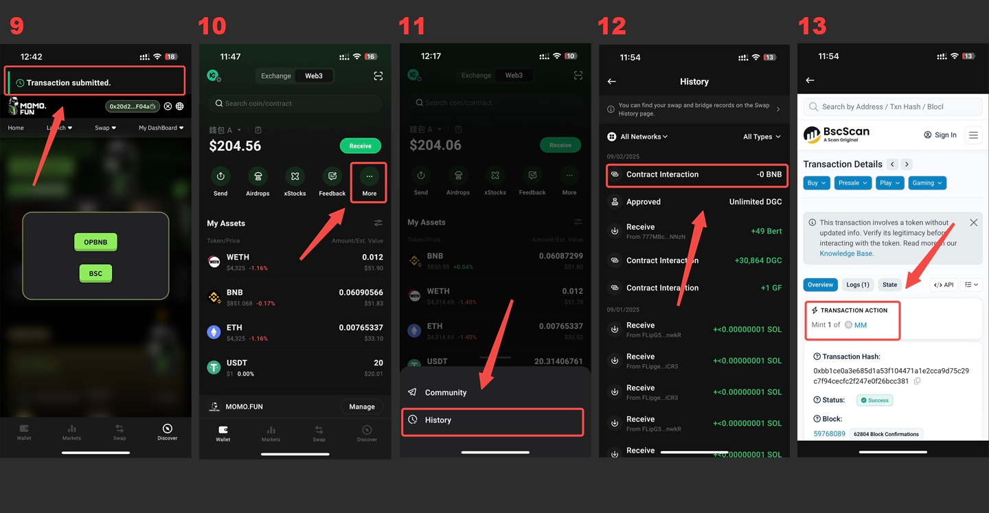 Click "Contract interaction" and open bscscan to view the chain information. When you see "Mint 1 of MM", it means the minting is successful.