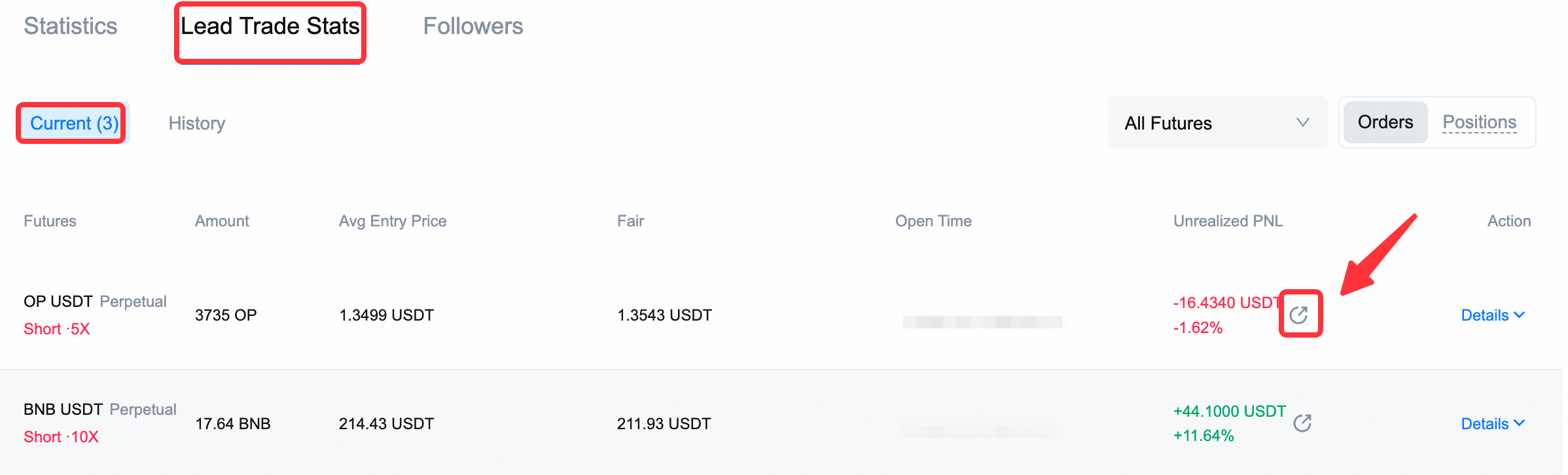 Instructions: From the Copy Trade page, visit the trader's page, click on [Lead Trade Stats] - [Current].