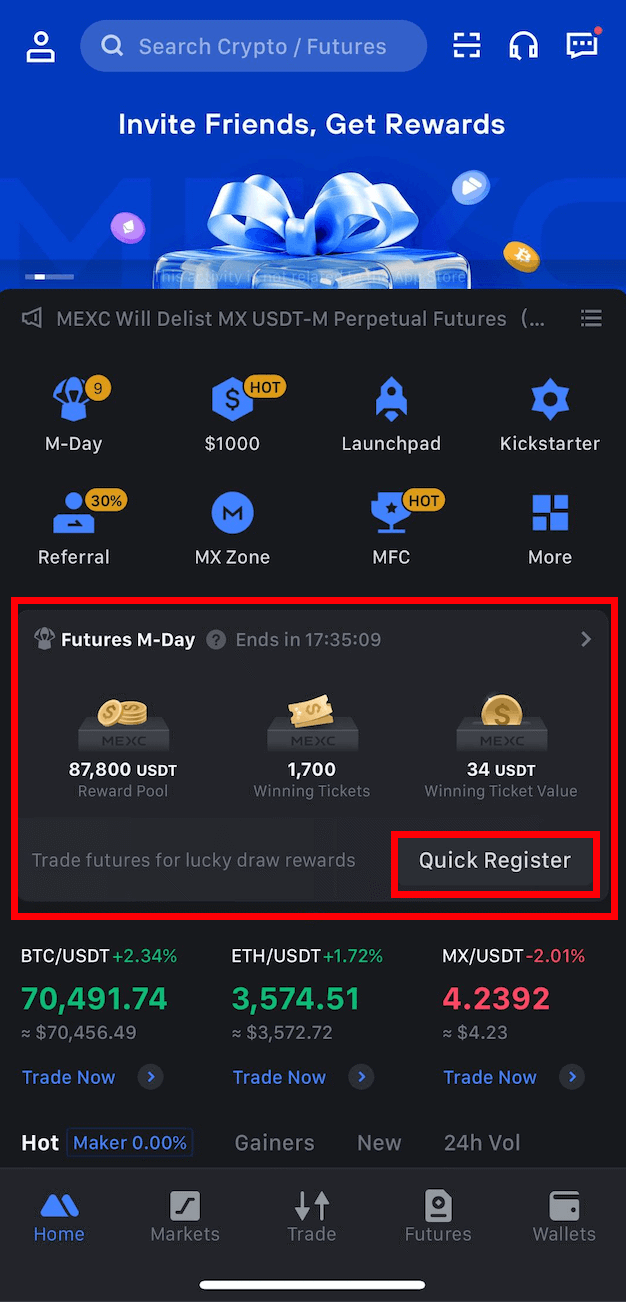 You can check information such as the reward pool, winning tickets, and winning ticket value for the current M-Day event from the card. By clicking [Quick Register], you can register for the current M-Day event. Once registered successfully, the event progress on the card will be updated in sync with your trading status.