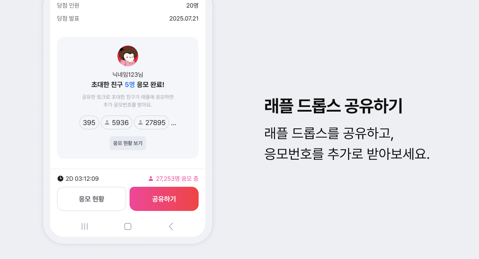 래플 드롭스에 응모한 뒤 공유하기 버튼을 통해 친구를 초대하고, 해당 친구가 응모를 완료하면 한 명당 추가 응모번호 1개를 받을 수 있습니다. - 예를 들어, 친구 3명에게 링크를 공유한 뒤 2명이 응모했다면 2개의 응모번호를 추가로 획득할 수 있습니다.
