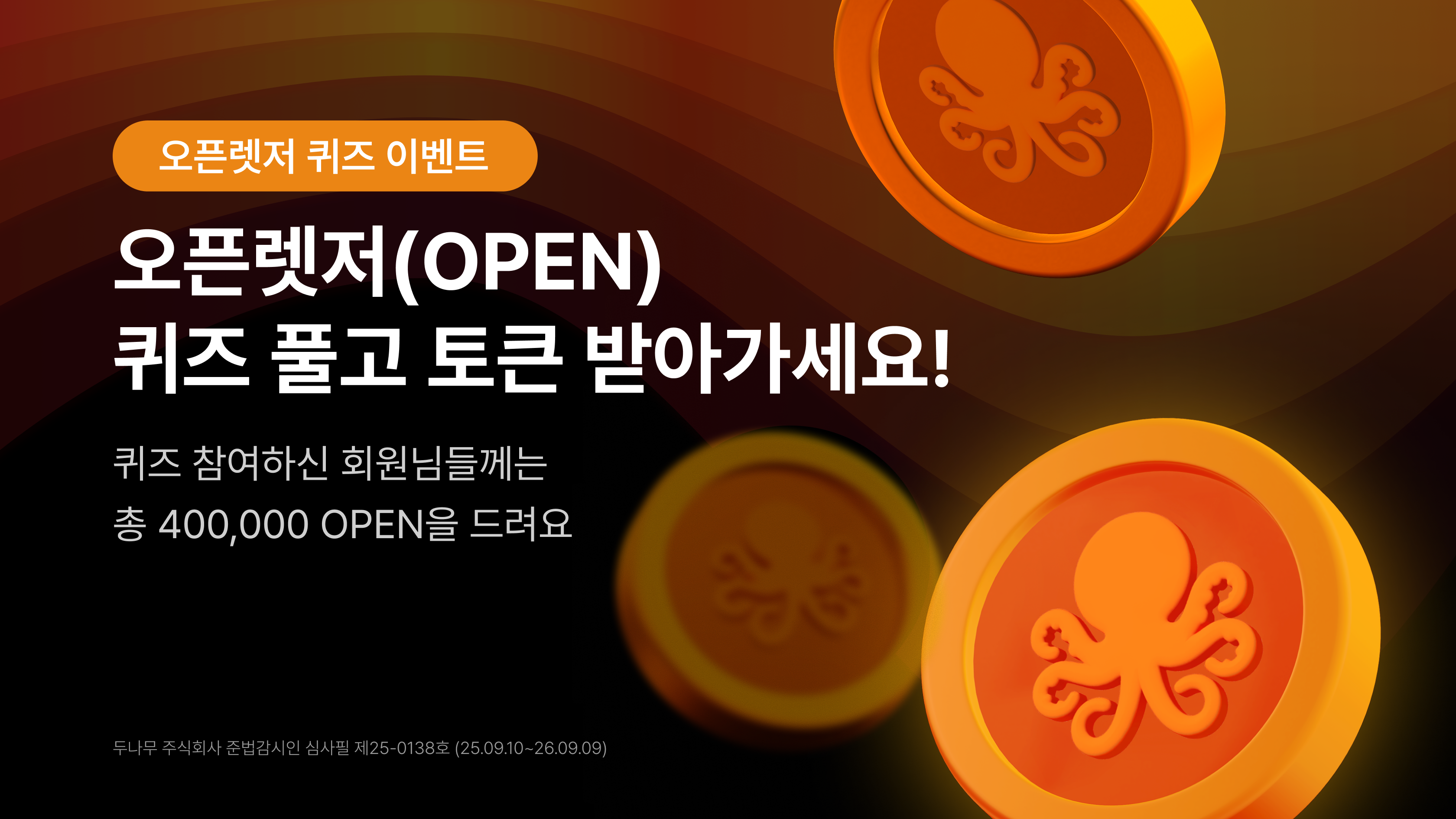 오픈렛저(OPEN)에서 업비트 회원님들을 위한 퀴즈 이벤트를 진행합니다. 프로젝트에 대해 알아보고 토큰도 받아가세요!정답을 모두 맞추신 선착순 80,000명에게 총 400,000 OPEN 경품을 나눠드려요!*본 이벤트는 프로젝트 측 요청으로 진행하는 이벤트입니다.