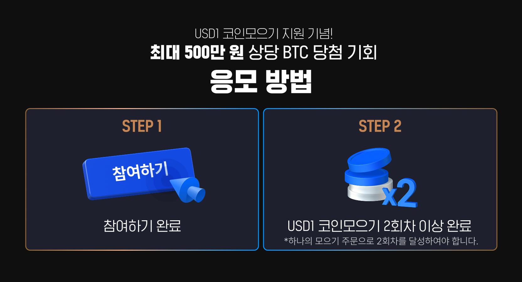 [USD1 코인모으기 추가 기념 ②] 500만 원 상당 BTC 당첨 기회! USD1 코인모으기하고 랜덤박스 받아가세요!