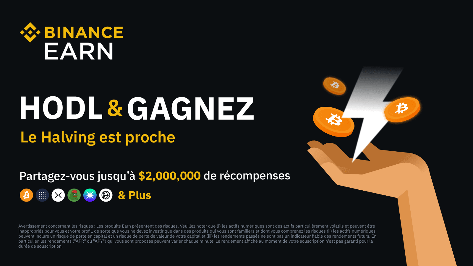 HODLez & GAGNEZ jusqu’au prochain halving avec Binance Earn : jusqu’à 2 000 000 $ de récompenses à partager !