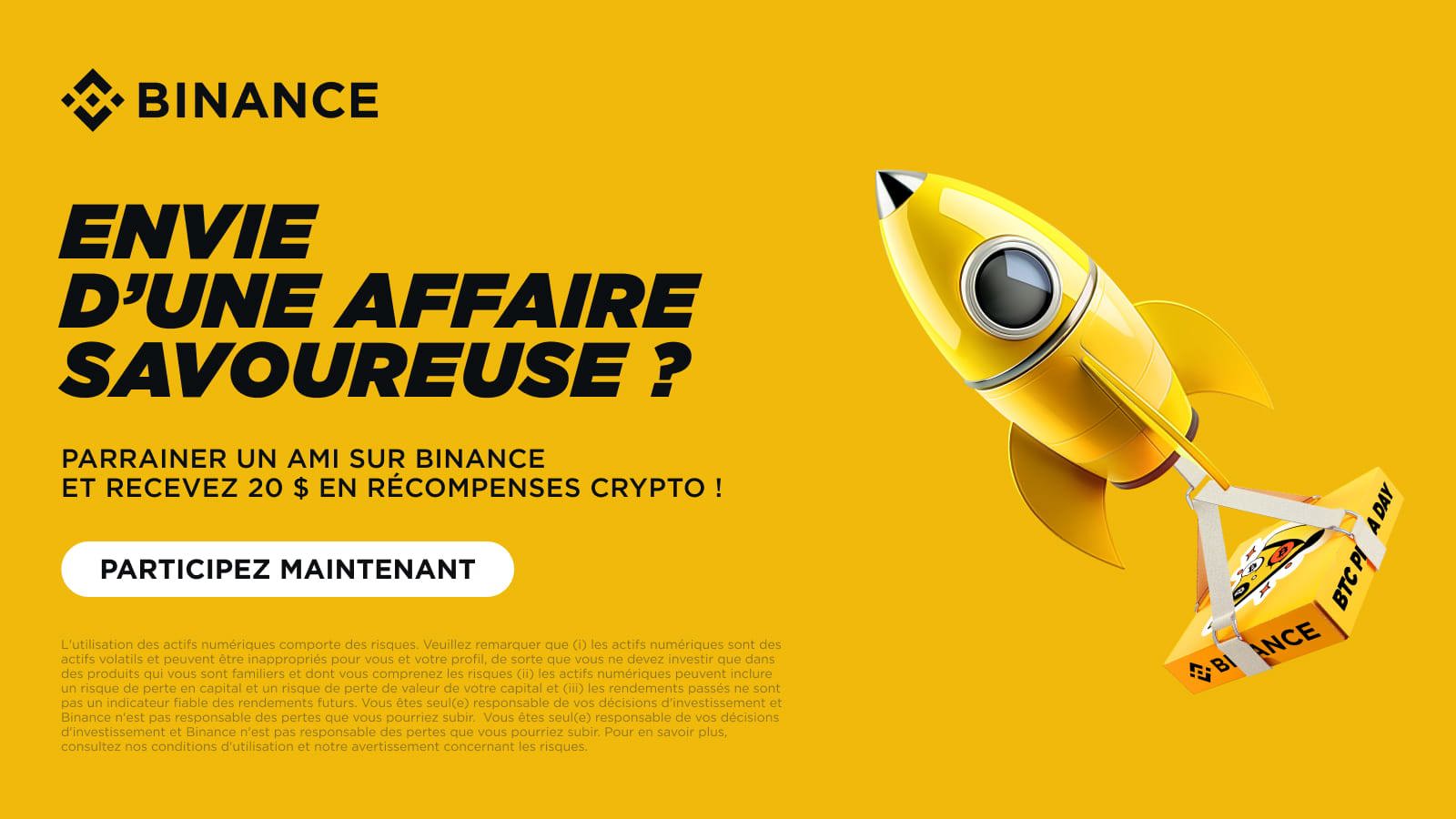 Invitez vos ami(e)s à créer un compte Binance en utilisant votre ID/lien de parrainage standard. Gagnez 20 USDT (dans le centre de récompense) pour chaque filleul(e) qui vérifie son identité et réalise un volume de trading cumulé équivalent à au moins 50 USD sur n’importe quelle(s) paire(s) Spot et sur marge pendant la Période de l’activité, selon le principe du premier arrivé, premier servi.