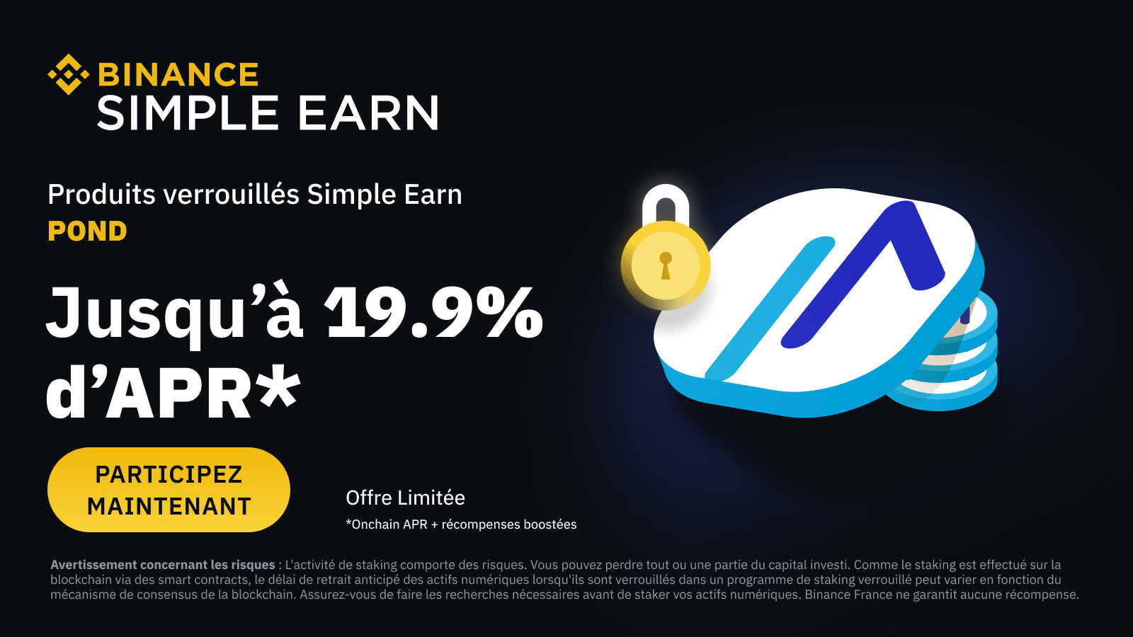 Binance Simple Earn lance le POND sur les produits verrouillés. Souscrivez des POND sur les produits verrouillés Simple Earn pendant la période de la promotion et obtenez jusqu’à 19,9 % de récompenses sous forme d’APR.