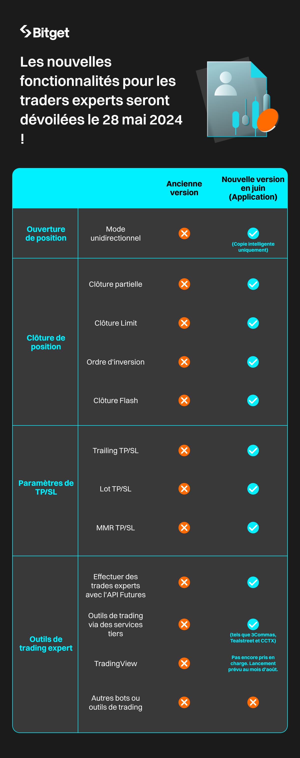 Pour vous remercier de votre fidélité et de votre intérêt pour le Copy Trading Futures de Bitget, nous mettrons à jour la fonctionnalité de trading expert de Futures le 28 mai 2024, ce qui vous offrira une expérience de trading plus pratique et pertinente !