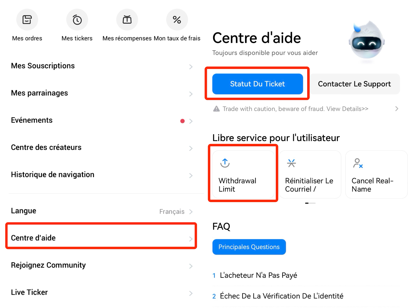 Pour garantir la sécurité de votre compte et de vos fonds, notre équipe peut demander des documents supplémentaires tels qu'une vérification KYC par vidéo ou une preuve de l'origine des fonds. Veuillez suivre les instructions et soumettre tous les documents requis dans le délai spécifié. Vous pouvez suivre l'état de votre demande à tout moment sous [Support] → [Statut Du Ticket].