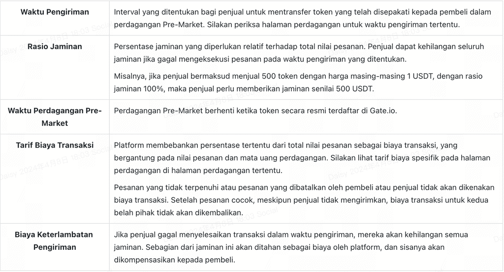 Perdagangan Pre-Market Gate.io adalah layanan perdagangan Over-the-Counter (OTC) yang memungkinkan investor membeli dan menjual token baru sebelum listing resmi mereka. Hal ini memungkinkan pengguna untuk menetapkan harga dan memperdagangkan token pada harga yang diantisipasi sebelum perdagangan publik dimulai.
