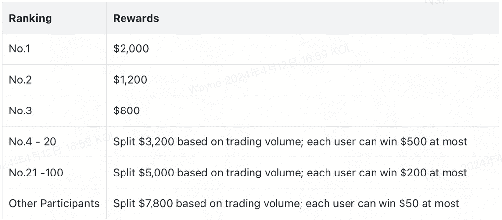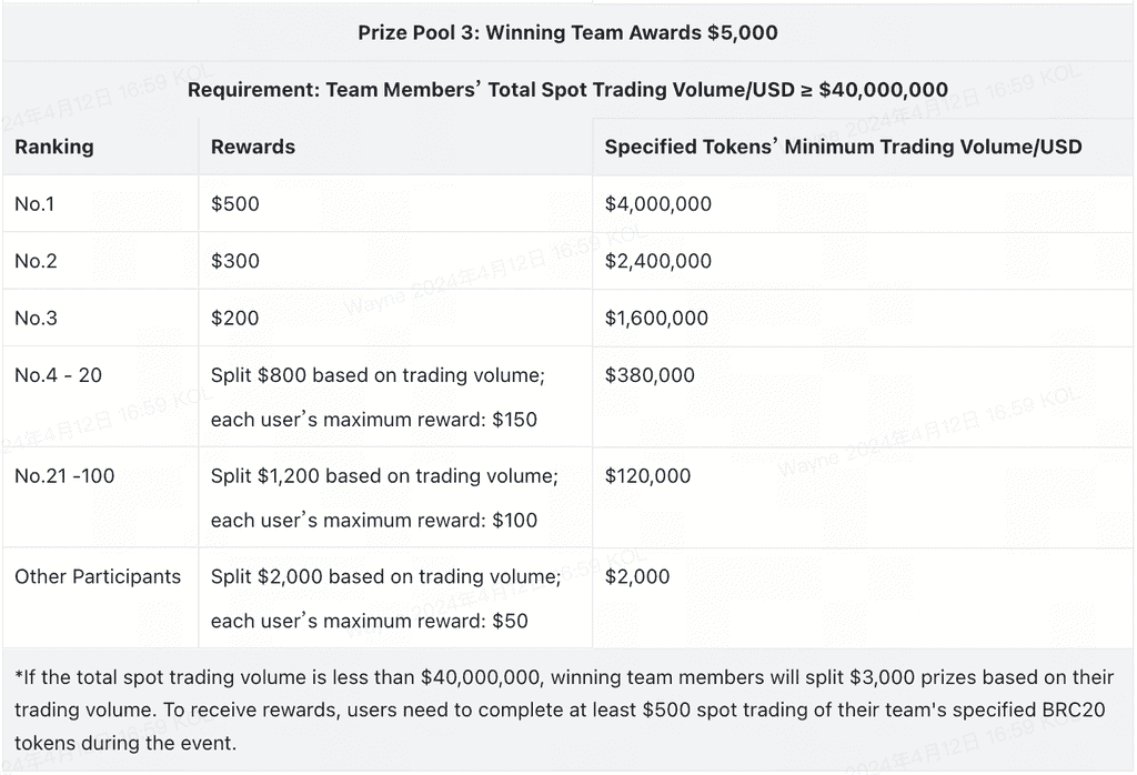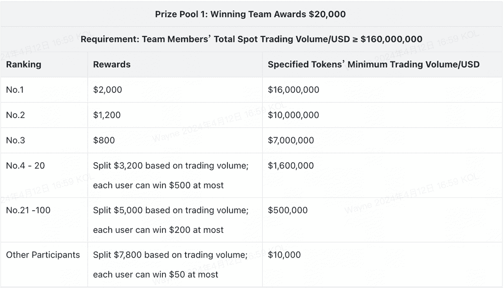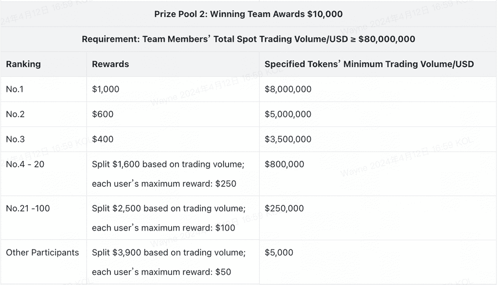 🏆Bonus 1: Penghargaan Tim Pemenang Tim pemenang dapat membagi hadiah hingga $20.000, yang anggotanya akan membagi hadiah berdasarkan peringkat perdagangan spot token tertentu.